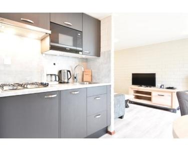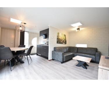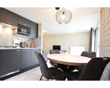Das Wohnzimmer dieses Ferienhauses ist ein schöner Ort zum Entspannen. Dank der großen Schiebetüren fällt viel natürliches Licht herein und Sie haben direkten Zugang zur sonnigen Terrasse. Der PVC-Boden in Holzoptik sorgt für eine warme und moderne Atmosphäre, während die offene Küche dem Raum einen geräumigen und gemütlichen Charakter verleiht. Ob Sie sich mit einem Buch auf dem Sofa entspannen oder gemeinsam eine Mahlzeit genießen, dieses Wohnzimmer bietet zu jeder Jahreszeit Komfort und Atmosphäre.