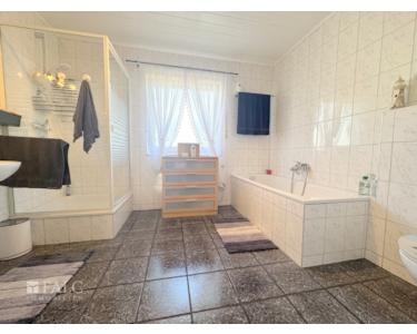 Das große Badezimmer verfügt über eine Badewanne und eine separate Dusche sowie ein Fenster, das für natürliches Licht und Belüftung sorgt, was den Raum besonders hell und freundlich macht.