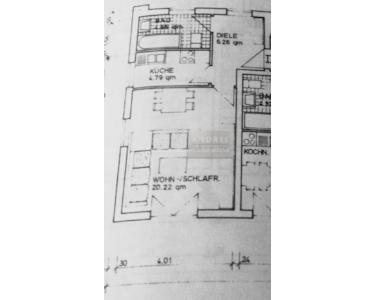 Die kleine Wohnung im Erdgeschoss verfügt über ein großes Wohn,- Schlafzimmer, eine Diele, eine Küche und ein Bad.