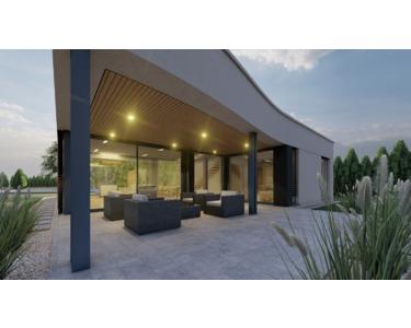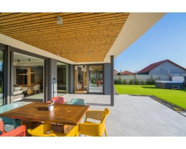 - Nagy üvegfelületek, egyedi gyártású és színű (Hofstädter), 3-rétegű üvegezésű tolóajtók, elektromos zsalúziával, szúnyoghálóval