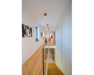 - A földszinti előtérből tágas, galériás nappali tárul elénk, egyedi lebegő lépcsővel, az emeleti lépcsőfeljárót szegélyező áttetsző, edzett üvegkorlát elemekkel
