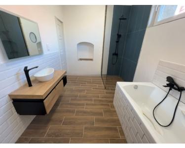 Die Badezimmer repräsentieren klare Modernität und Eleganz: Ein geräumiges, helles Badezimmer bietet Komfort, während eines der Schlafzimmer über eine eigene Dusche verfügt. Für den Komfort der Gäste gibt es neben dem Flur eine Toilette mit offener Dusche.