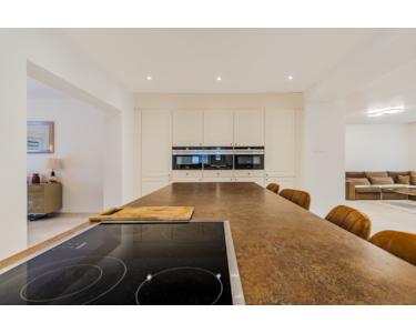 Luxuriöse, halb offene Küche mit Anbauküche und Kochinsel, ausgestattet mit Backofen, Mikrowelle, Kaffeevollautomat, Keramikkochfeld, Geschirrspüler und freihängender Dunstabzugshaube.