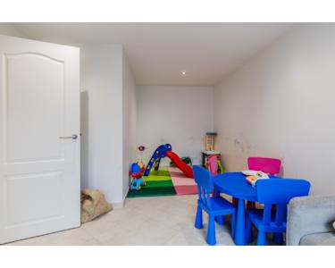 Büro/Arbeitszimmer, derzeit als Spielzimmer genutzt, mit Außentür.