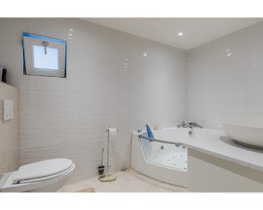 Hochwertiges Badezimmer mit Whirlpool, Waschtisch, Toilette und Vorbereitung für eine begehbare Dusche.