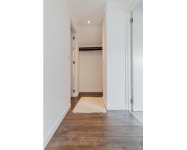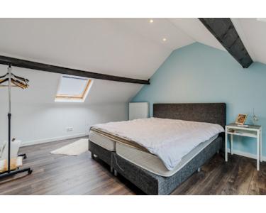 Schlafzimmer mit Dachfenster und Einbauschränken.