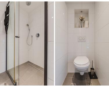 Luxuriöses zweites Badezimmer mit begehbarer Dusche, Waschtisch und Toilette.