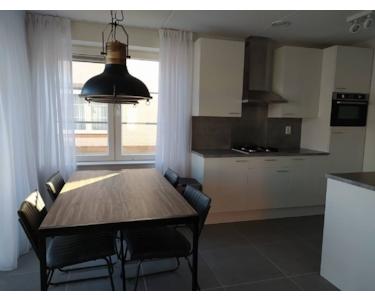 Durch den Eingang betreten Sie einen geräumigen Flur, der Zugang zum Zählerschrank, der Toilette, der Treppe und dem L-förmigen Wohnzimmer bietet. Das helle und geräumige Wohnzimmer mit Schiebetüren/Schiebefenster zur Terrasse ist zur Küche hin offen. Im Wohnzimmer finden Sie eine Kombination aus Leder, Holz und Schwarz, die für einen coolen Look sorgt. Die moderne Küche ist mit allen notwendigen und integrierten Geräten ausgestattet. Angrenzend an die Küche befindet sich ein Hauswirtschaftsraum mit Waschmaschine und Trockner. Schließlich gibt es noch einen geräumigen Abstellraum für den Eigentümer, der nur dem Eigentümer zugänglich ist (bei Anmietung des Hauses).