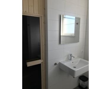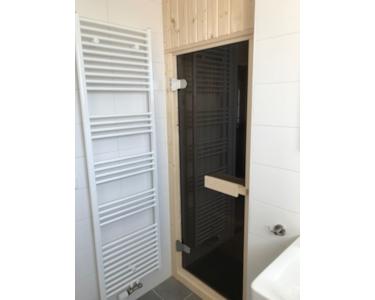 Das geräumige Badezimmer verfügt über ein Waschbecken, eine Dusche und eine Toilette. Dieses Badezimmer bietet auch Zugang zu einer Sauna (Infrarot).