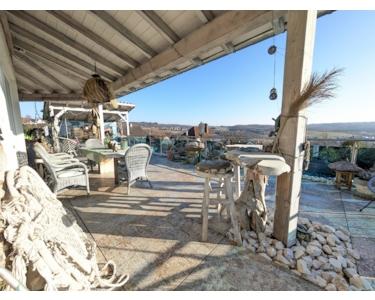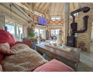 Das Haupthaus verfügt über eine offene Architektur mit hohen Decken, Sichtbalken und einer stilvollen Kombination aus Naturmaterialien und modernen Elementen. Der Wohnbereich ist geprägt von einem gemütlichen Kaminofen, großzügigen Fensterfronten und direkten Zugängen zu der weitläufigen Terrasse, die mit Glasgeländern für eine ungestörte Aussicht sorgen.