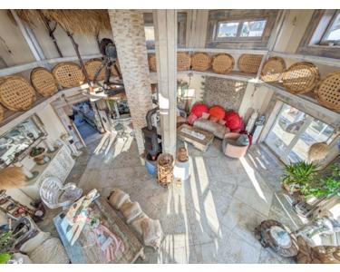 - Offenes Wohnkonzept mit hohen Decken und rustikalen Holzelementen
