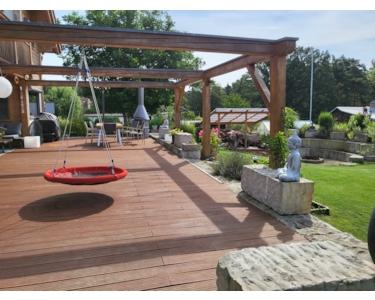 Der große, gepflegte Garten ist ein wahres Highlight und lädt zu gemütlichen Abenden am Lagerfeuer ein. Eine Sauna mit Blick ins Grüne bietet Entspannung pur und in der zusätzlichen Infrarotkabine kann man sich schnell im Winter aufwärmen. Die riesige Terrasse ist ideal für gesellige Stunden im Freien.