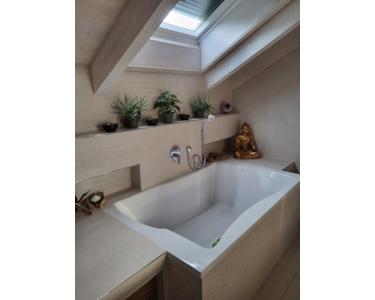 * modern gefliestes Masterbad mit Wanne und bodengleicher Dusche im Obergeschoss
