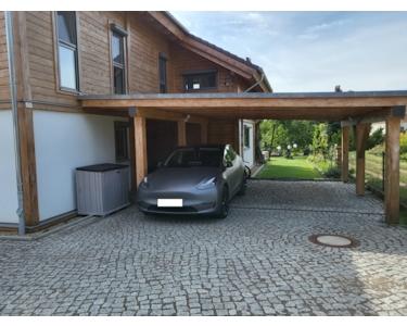 Vor dem Haus befindet sich ein gepflasterter Hof mit einem großzügigen Carport, der Platz für mindestens zwei Autos bietet.