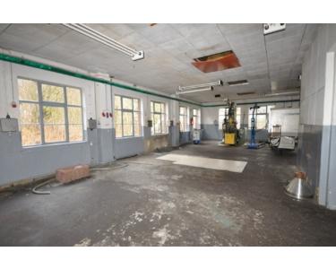 Baujahr 1925, Mauerwerk, Pult-Holzdach mit Schweißbahnen, Fenster aus einfach verglastem Holz, Fußboden mit Estrich, Holzschiebetür, Laderampe, ca. 90 m²