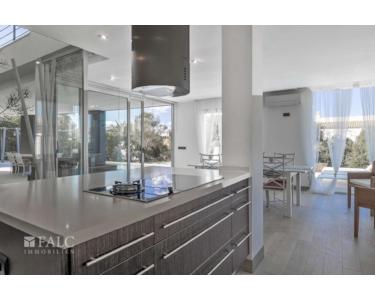 Schon beim Betreten der Villa werden Sie von einer eleganten und warmen Atmosphäre empfangen. Große Fensterfronten lassen den Innen- und Außenbereich miteinander verschmelzen und bieten einen freien Blick auf den traumhaften Garten und den beeindruckenden Infinity-Pool. Der stilvolle Wohnbereich geht fließend in die offene Designer-Küche über – ein Ort, an dem Geselligkeit und Komfort aufeinandertreffen.