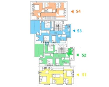 Haus S2 besteht aus zwei Etagen (Erdgeschoss und erster Stock) und einem Hof mit einer Gesamtfläche von 53 m2. Im Erdgeschoss gibt es einen überdachten Eingang, einen Abstellraum, ein Badezimmer, eine Küche mit Esszimmer und ein Wohnzimmer mit Zugang zu einer überdachten Terrasse. Eine Innentreppe führt in den ersten Stock, wo sich ein Flur, drei Schlafzimmer, ein Badezimmer und eine Loggia befinden.