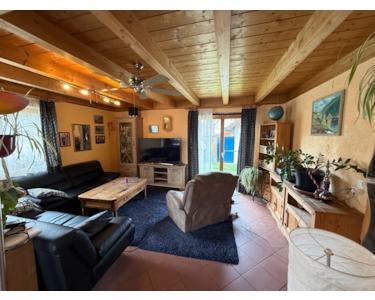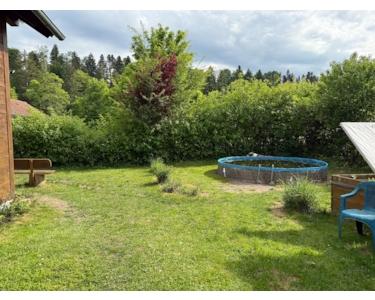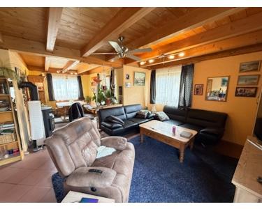 Zusätzlich zu den Schlaf- und Badezimmern verfügt das Einfamilienhaus über eine schöne Küche und ein großes Wohnzimmer mit Kaminofen und Zugang zum großzügigen Garten, hier befindet sich auch ein Pool.