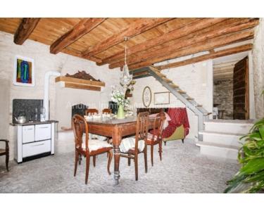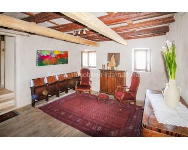 Der erste Stock ist über eine Treppe aus Eisen und Holz erreichbar, hier finden wir das Wohnzimmer ideal als Ruheraum mit Holzboden, originalen Sichtbalken.