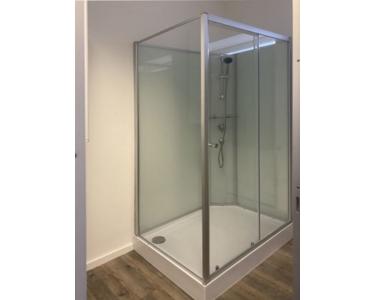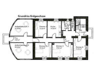 Das Erdgeschoss kann sowohl vom Treppenhaus als auch über den Anbau begangen werden. Die EDV-Verkabelung verläuft in Kanälen. Der Serverschrank ist im Aufenthaltsraum untergebracht. Ein Büroraum wurde zu einem Bad mit drei Duschen und Waschmaschinenanschluss umgebaut. Die WCs sind hell gefliest.