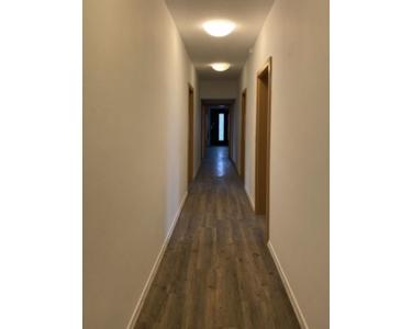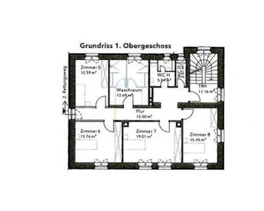Das Obergeschoss ist ohne Anbau und vom Grundriss identisch mit dem Erdgeschoss. Die EDV-Verkabelung verläuft ebenfalls in Kanälen. Der Waschraum wurde zum Büro umgebaut. Die Büroräume sind mit Deckenleuchten, der Flur ist mit einer abgehängten Decke mit integrierten Leuchten ausgestattet. Die WCs sind hell gefliest.