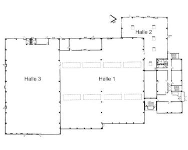Die Halle 3 mit Fußbodenheizung hat eine Höhe von ca. 7,50 m und ist mit Betonboden. Die Belichtung erfolgt über Lichtbänder und einer umlaufenden Fensterfront. Ein Meisterbüro mit angrenzenden WCs sind abgetrennt. Die EDV- und Telefonverkabelung verläuft in Brüstungskanälen. Neben dem Meisterbüro befindet sich ein Rolltor mit ca. 3 m Breite und ca. 3,70 m Höhe. In der Halle sind noch zwei weitere gleichgroße Rolltore verbaut.