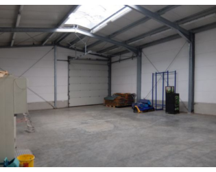 Die angebaute Halle mit Betonboden wurde in Skelettbauweise errichtet. Sie ist über ein ca. 3,50 m x 5,00 m großes Sektionaltor befahrbar. Eine Lichtkuppel und Deckenleuchten sorgen für gute Belichtung.