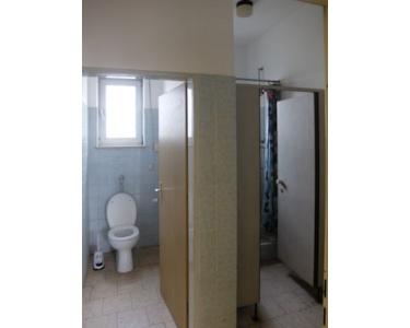 Im Erdgeschoss befindet sich die geflieste Verkaufsfläche. Sie ist über eine große doppelseitige Glasschiebetür und über einen Nebeneingang begehbar. Das Büro ist ebenso wie das Duschbad mit WC gefliest und mit Deckenleuchten ausgestattet.