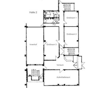 Das Bürogebäude ist im Erdgeschoss über einen repräsentativen Vorraum mit Empfang mit Natursteinboden begehbar. Hier befinden sich drei Großraumbüros mit Vinylboden, ein Aufenthaltsraum mit Laminat und Küchenzeile sowie eine hell geflieste WC-Anlage. Der Flur ist ebenfalls mit Naturstein ausgelegt. Der Innenhof ist über eines der Großraumbüros erreichbar. Die EDV- und Telefonverkabelung verläuft in Kabelkanälen und Bodentanks. Leuchten sind vorhanden.