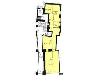 Der klimatisierte Laden mit Teppichboden ist sowohl über die verglaste Eingangstür als auch vom Treppenhaus aus begehbar. Von der Ladenfläche wurde in Trockenbau ein Raum abgetrennt. Das sich über die ganze Ladenbreite erstreckende Schaufenster bietet beste Werbe- und Präsentationsmöglichkeiten und bringt Tageslicht in die Verkaufsfläche. Eine Lichtkuppel bringt zusätzlich Licht in den Laden. Er ist mit Teppichboden, EDV-Verkabelung und mit Leuchten ausgestattet. Die Küche wurde als Labor genutzt und die Küchenanschlüsse stillgelegt. Im Lager 2 sind Küchenanschlüsse vorhanden. Das WC ist hell gefliest.