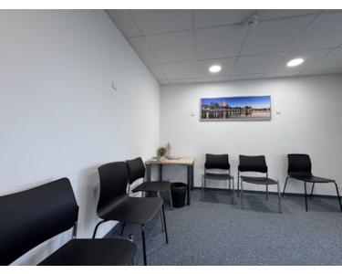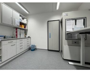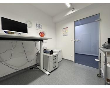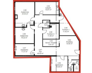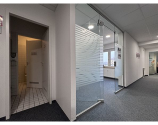 Im 2. Obergeschoss befindet sich eine weitere ca. 188 m² große barrierefreie Praxis- oder Bürofläche. Sie ist momentan als Praxis vermietet und ausgestattet mit PVC-Böden, abgehängten Decken mit integrierten Leuchten. Die WCs sind hell gefliest. Der Vermieter ist bereit, Umbaumaßnahmen nach den Wünschen des Mieters vorzunehmen.