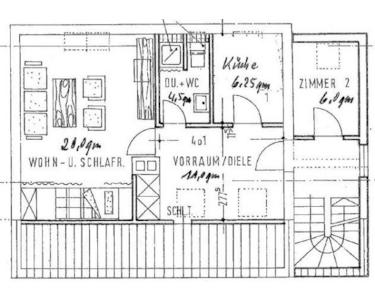Die 2-Zimmerwohnung im Dachgeschoss ist gut geschnitten. Die Küche ist mit einer Einbauküche ausgestattet. Das Bad mit Fenster, Wanne, Waschbecken und WC ist gefliest.