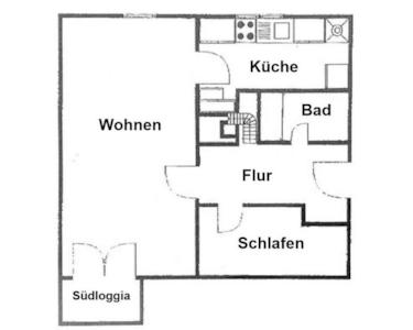 Über den gefliesten Flur mit Gegensprechanlage sind alle Wohnräume begehbar. Das Wohnzimmer ist mit Laminatboden ausgelegt und bietet Zugang zur Küche sowie zur Südwest-Loggia. Die durch die großen Gaubenfenster sehr helle und geflieste Küche ist mit einer Einbauküche versehen, welche mit Cerankochfeld, Spülmaschine sowie einer großen Kühl-Gefrier-Kombination ausgestattet ist. Auch das Schlafzimmer mit Gaube ist mit Laminatboden ausgelegt, ein Einbauschrank ist vorhanden. Im gefliesten Bad befindet sich eine Wanne mit Badewannenaufsatz zum Duschen. Zudem ist es mit Waschbecken, WC und Waschmaschinenanschluss ausgestattet.