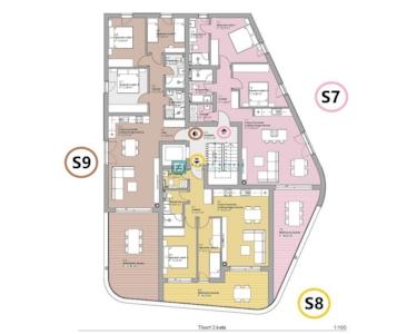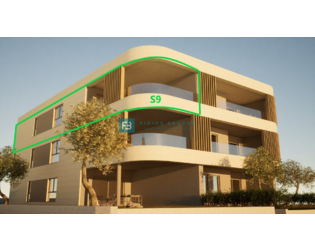 Die Wohnung S9 mit einer Gesamtnutzfläche von 107,49 m² (Wohnfläche 79,59 m² + Terrasse 27,90 m²) + Stellplatz 12,50 m² befindet sich im 2. Obergeschoss. Sie ist nach Südwesten ausgerichtet und besteht aus einem Eingangsbereich, einem Flur, drei Schlafzimmern, zwei Bädern, einer Küche mit Esszimmer und einem Wohnzimmer mit Zugang zu einer großen überdachten Terrasse von 27,90 m² mit herrlichem Meerblick. Zur Wohnung gehört ein Stellplatz im Innenhof des Gebäudes. Der Kaufpreis beträgt 460.000 € (inkl. MwSt. – der Käufer ist von der Zahlung der 3%igen Grundsteuer befreit).