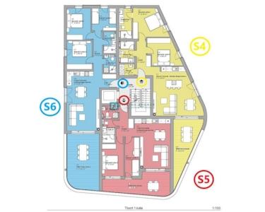 Die Wohnung S6 mit einer Gesamtnutzfläche von 107,49 m² (Wohnfläche 79,59 m² + Terrasse 27,90 m²) + Parkplatz 12,50 m² befindet sich im 1. Stock. Sie ist nach Südwesten ausgerichtet. Sie besteht aus einem Eingangsbereich, einem Flur, drei Schlafzimmern, zwei Badezimmern, einer Küche mit Esszimmer und einem Wohnzimmer mit Zugang zu einer großen überdachten Terrasse von 27,90 m² mit herrlichem Meerblick. Zur Wohnung gehört ein Parkplatz im Innenhof. Der Kaufpreis beträgt 420.000 € (inkl. MwSt. – der Käufer ist von der Grundsteuer in Höhe von 3 % befreit).