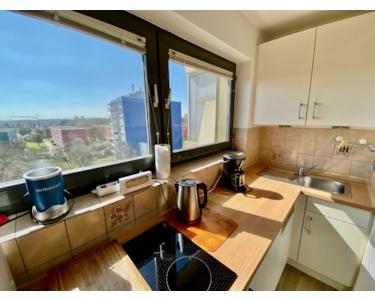 Von der kleinen Loggia, dem Schlafzimmer und der Küche öffnet sich der freie Blick über die Stadt.