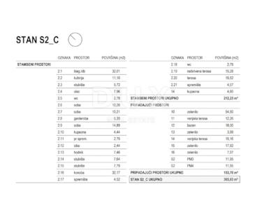 Wir bieten Ihnen eine Immobilie, die Ihnen modernes Design und Eleganz, Komfort und erstklassige Ausstattung bietet und sich in einer schönen, ruhigen Lage in der Nähe von öffentlichen Verkehrsmitteln, Schulen, Kindergärten, Einkaufszentren und zehn Autominuten von Rijeka befindet. Der Komplex aus 4 Wohnhäusern mit insgesamt 8 Wohnungen liegt nördlich der Adria-Autobahn im Gebiet „Zelena Kostrena“ von wo aus sich ein wunderschöner Ausblick auf die gesamte Kvarner Bucht bietet. In unmittelbarer Nähe gibt es 10 Kilometer gepflegte Wander-, Rad- und Fitnesswege, die durch die höchsten Teile von Kostrena vom Gipfel Solin bis zum Gipfel Sopalj führen. Die Zufahrt zu den Häusern erfolgt über die obere Straße, wobei eine Verbesserung und Erweiterung der bestehenden Straße geplant ist. Zu jedem Haus gehören vier Außenstellplätze, das heißt zwei Stellplätze pro Wohneinheit. Jedes Haus besteht aus zwei Wohnungen. Dabei liegen die Wohnungen der oberen beiden Grundstücke übereinander, während die Wohnungen der unteren beiden Grundstücke nebeneinander liegen. Zu jeder Wohnung gehört ein Gartenanteil. HAUS C Wohnung S2 - C: WOHNFLÄCHEN: - Wohnzimmer / Esszimmer 32,01 - Küche 11,10 - Treppenhaus 5,72 - Eingang 7,96 - Toilette 2,78 - Zimmer 10,20 - Zimmer 10,21 - Garderobe 5,39 - Zimmer 14,89 - Badezimmer 4,44 - Waschküche / Abstellraum 2,75 - Speisekammer 2,44 - Flur 7,46 - Treppenhaus 7,64 - Treppenhaus 7,79 - Taverne 32,17 - Abstellraum 4,52 - Toilette 2,79 - überdachte Terrasse 15,28 - Terrasse 15,52 - Abstellraum 4,57 - Badezimmer 4,60 GESAMTWOHNFLÄCHEN: 212,23 m² ZUGEHÖRIGE FLÄCHEN: - Grünfläche 54,50 - Außenterrasse 12,26 - Schwimmbad 18,00 - Begrünung 3,99 - Außenterrasse 15,16 - Begrünung 17,92 - Begrünung 7,97 - Stellplatz 3 11,95 - Stellplatz 4 11,95 ZUGEWIESENE PLÄTZE GESAMT: 153,70 m² WOHNUNG S2-C GESAMT: 365,93 m² Diese luxuriöse Wohnung ist auf maximalen Komfort ausgelegt. AUSSTATTUNG: Das Haus, in dem sich die Wohnung befindet, ist gut gebaut und luxuriös ausgestattet, alle eingebauten Materialien, Boden- und Wandbeläge entsprechen den höchsten Standards. - 10 cm dicke Fassadendämmung - Fußbodenheizung - Wärmepumpen - hochwertige Aluminium-Tischlerei. Zur Wohnung gehört ein eigener Garten und 2 PKW-Stellplätze. PREIS: Der angegebene Preis bezieht sich auf eine komplett fertiggestellte schlüsselfertige Anlage, ohne Möblierung. Der Preis beinhaltet die gesetzliche Mehrwertsteuer, der Käufer ist von der Zahlung der Grundsteuer befreit. Bei einem Kauf von einem in Kroatien registrierten Unternehmen ist nach dem Verkauf eine volle Mehrwertsteuerrückerstattung möglich. Sauberes und ordentliches Anwesen. Sicherlich eine wunderschöne Immobilie für luxuriöses Familienleben, aber auch als Investition in Form von Elitetourismus geeignet. EINZIGARTIGES ANWESEN, DAS IHRE AUFMERKSAMKEIT UNBEDINGT WERT IST UND IN EINER TOLLEN LAGE LIEGT!!! KOSTRENA Kostrena ist eine alte, beliebte Küstenstadt, die erstmals zu Beginn des 15. Jahrhunderts erwähnt wurde. Im Jahr 1874 erlangte die Stadt erstmals ihre kommunale Unabhängigkeit, die sie jedoch nur für sehr kurze Zeit, nämlich nur zwei Jahre, behielt. Es ist in zwei Teile gegliedert, St. Lucia und St. Barbara, nach den Namen zweier Kirchen, die es in dieser Gegend gibt. Kostrena liegt in unmittelbarer Nähe der Stadt Rijeka, eingerahmt von der Bucht Martinšćica und der Bucht von Bakar. Die Halbinsel Kostrena ist etwa 10 Kilometer lang und fällt sanft zur Küste hin ab. Auf seiner gesamten Länge gibt es wunderschöne Strände, die im Sommer von Tausenden von Badegästen besucht werden. Die bekanntesten und am meisten besuchten sind jene in der Bucht von Žurkovo, gefolgt von Smokvinovo, Svežanj, Spužvina, Podražica, Nova voda und Perilo. Kostrena besteht aus etwa zwanzig Siedlungen, von denen viele nach Familien benannt wurden. Die bevölkerungsreichsten Orte sind heute Vrh Martinšćice, Glavani und Sv. Lucija, Rožmanići, Doričići und Paveki. Ein charakteristisches Karstgebiet mit mediterraner Vegetation und der berühmten Kostrena-Grotte sowie ein mildes Klima, das manchmal starken Bora-Böen weicht, sind die Merkmale dieser Region.