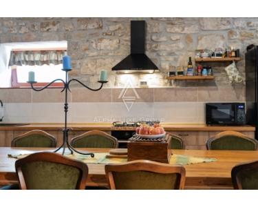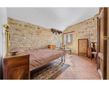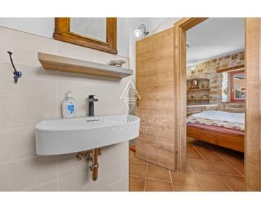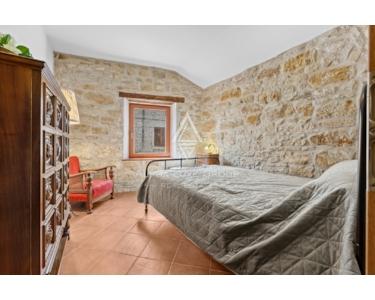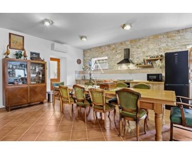 Das Erdgeschoss besticht durch ein großzügiges Open-Space-Konzept – selten für die istrische Architektur – das Alt und Neu perfekt verbindet. Es umfasst ein Wohnzimmer, eine Küche mit Essbereich für zehn Personen, ein Badezimmer sowie ein vielseitig nutzbares Zimmer – ideal als Gästezimmer oder Büro.