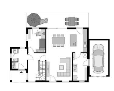 Die Hausarchitektur überzeugt mit Modernität und vielen Details. Die Garage schmiegt sich ans Gebäude an. Hinter der Garage entsteht ein behaglicher, geschützter Terrassenbereich. Die Wohnraumerweiterung im Erdgeschoss setzt sich in einer Terrassenüberdachung fort. Durch die Planung eines Nebeneingangs, kann die Garage auf kürzestem Weg vom Hauswirtschafts-/Haustechnikraum aus betreten werden. Der moderne Hausentwurf bietet auf 170 m² Grundfläche viel Platz für die gesamte Familie. Der Wohn-/Ess- und Kochbereich öffnet sich über 2 große Panorama-Hebeschiebetüren, 2 Terrassentüren und ein bodentiefes Fensterelement zur Terrasse und zum Garten hin. Der Kochbereich kann mit einer Kochinsel ausgestattet werden. Vier Schlafräume, davon einer mit einer separaten Ankleide, und zwei Bäder bringen Wohnkomfort ins Familienleben.