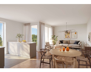 Die Wohneinheit verfügt über vier Räume, ein Masterbad mit bodengleicher Dusche und Badewanne sowie einen Abstellraum. Das über 30 m² große, lichtdurchflutete Wohnzimmer ist der Mittelpunkt der Wohnung und führt direkt auf den Balkon. Die offene Küche wurde geschickt als Nische im Wohnbereich integriert, sodass die Bereiche Wohnen, Essen und Kochen harmonisch ineinander übergehen, jedoch dennoch voneinander abgegrenzt bleiben.