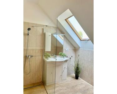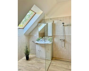 - Ein Badezimmer verfügt über eine Badewanne und eine ebenerdige Dusche, ein weiteres Badezimmer hat eine ebenerdige Dusche sowie eine separate Toilette und ein Waschbecken