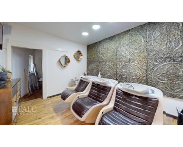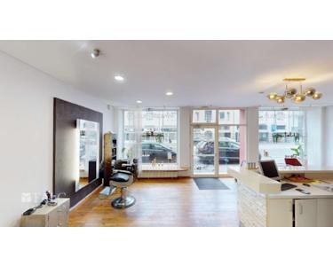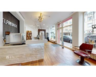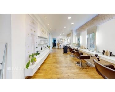Die Räumlichkeiten beherbergen einen stilvollen Friseursalon. Kunden werden in einem einladenden, großzügigen und hellen Raum empfangen, der sofort ein Gefühl von Eleganz und Professionalität vermittelt. Eine kleine, elegante Stahltreppe führt zu den Frisierplätzen, während man vorbei an einer großen Schiebetür, die zum ersten Innenhof hinausgeht, in den nächsten Raum gelangt. Hier befinden sich die Haarwaschplätze, gefolgt von einer praktischen Farbküche, die den Salonbetrieb effizient unterstützt.