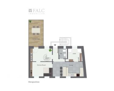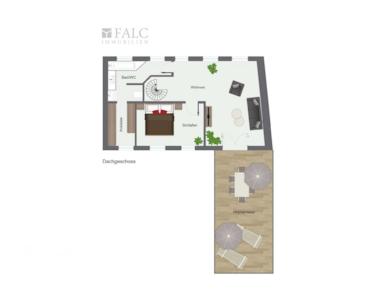 Eine stilvolle Wendeltreppe führt hinauf zur Dachetage, die 2007 in moderner Holzständerbauweise komplett neu errichtet wurde. In dieser lichtdurchfluteten Ebene befindet sich eine großzügige Galerie, die durch zwei große Glasflügeltüren Zugang zur oberen Dachterrasse bietet – perfekt für sonnige Stunden im Freien. Ebenfalls auf dieser Etage befindet sich das geräumige Schlafzimmer, das mit einem separaten Ankleidezimmer und einem luxuriösen Badezimmer ausgestattet ist. Dieses beeindruckende Bad verfügt über WC, Dusche und Badewanne, so dass keine Wünsche offenbleiben.
