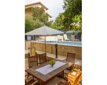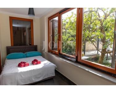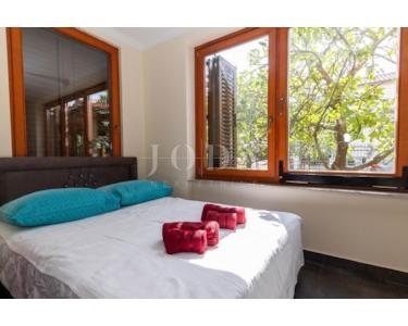 Der gesamte Garten ist mit istrischen Steinen dekoriert und gepflastert, während die Grünflächen mit Obstbäumen und mediterranen Pflanzen angereichert sind.