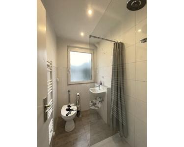 komplett sanierte Badezimmer, mit Dusche, WC und Waschtisch. Ein normal großes Fenster im Bad sorgt für