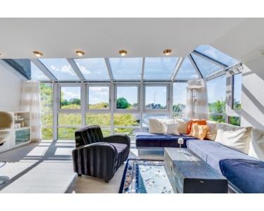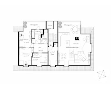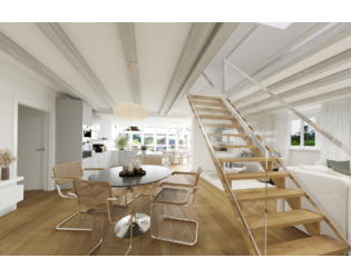 Die Maisonettewohnung erstreckt sich über das gesamte Dachgeschoss und bietet rund 163 m² Wohnfläche. Sie verfügt über drei Schlafzimmer, zwei Badezimmer, zwei Wintergärten und einen großzügigen Wohn- und Essbereich von etwa 76 m² mit integrierter Küche. Teilbereiche wurden als Galerie zum Dachspitz gestaltet und über eine Holztreppe verbunden.