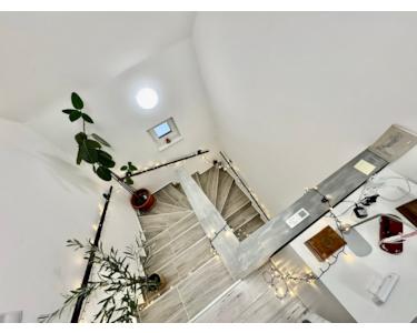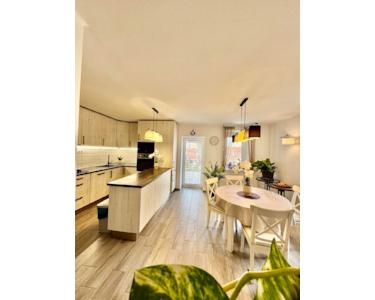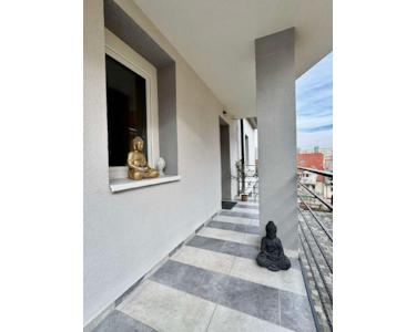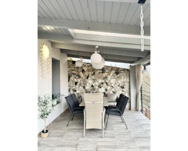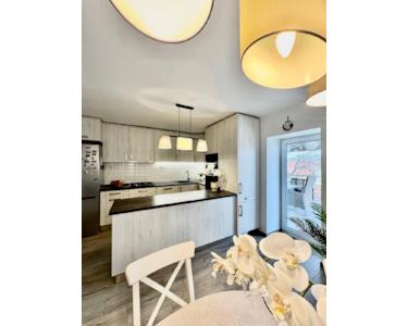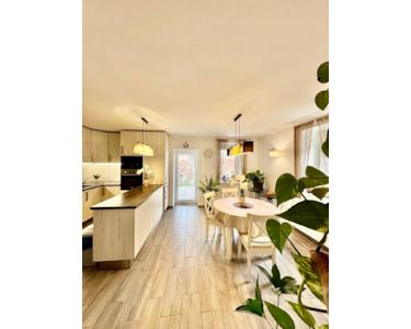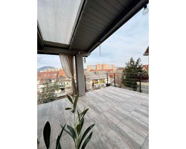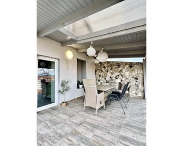 -auf der linken Seite finden wir das Esszimmer - Küche mit direktem Zugang zu einer 26 m² großen überdachten Terrasse mit Panoramablick auf die Stadt