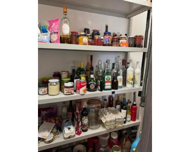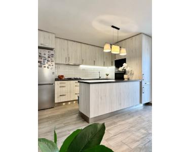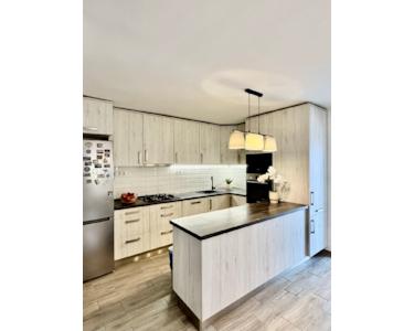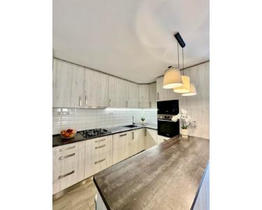 -Küche mit maßgeschneiderten mechanisierten Küchenmöbeln, BOSCH-Einbauküchengeräten, Elektroherd, Gaskochfeld, 12-Gänge-Geschirrspüler, ausziehbarer Dunstabzugshaube, Kühlschrank, SAMSUNG-Mikrowelle