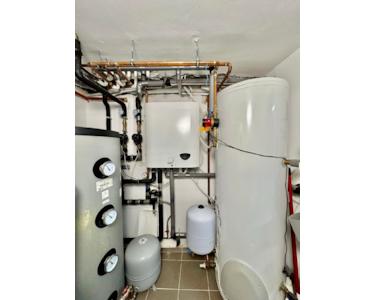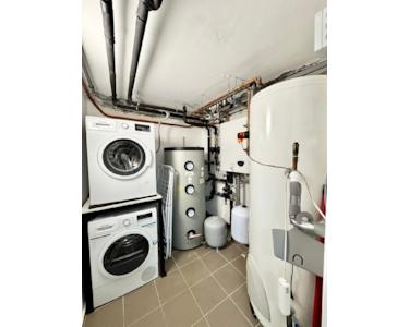 -auf dieser Ebene befinden sich auch der Heizraum mit der mechanischen Anlage, die Inneneinheit der Wärmepumpe und 2 300-l-Tanks sowie eine Waschmaschine und ein Trockner