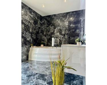 -BODENBELÄGE: hochwertiger Laminatboden in den Zimmern, Badezimmer mit 120 x 60 cm großen Keramikfliesen
